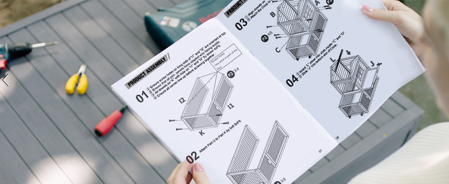 Two of us put this together in less than 30 minutes. All the holes are pre-drilled. They are also pegged in the most important parts. There are written instructions and pictures. The max chickens for this would be 4. Preferably 3 grown hens. I am buying a second to put inside my greenhouse for winter. I am using little giant hanging water feeders for the inside so they don't take up too much of space. This is a great bargain, easy to use, and beautiful.